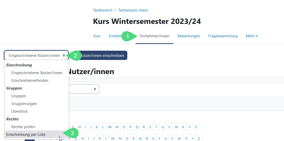 Die Einschreibung per Liste wird über die Kursnavigation aufgerufen. Klicken Sie dazu auf <Teilnehmer/innen - Eingeschriebene Nutzer/innen - Einschreibung per Liste>.