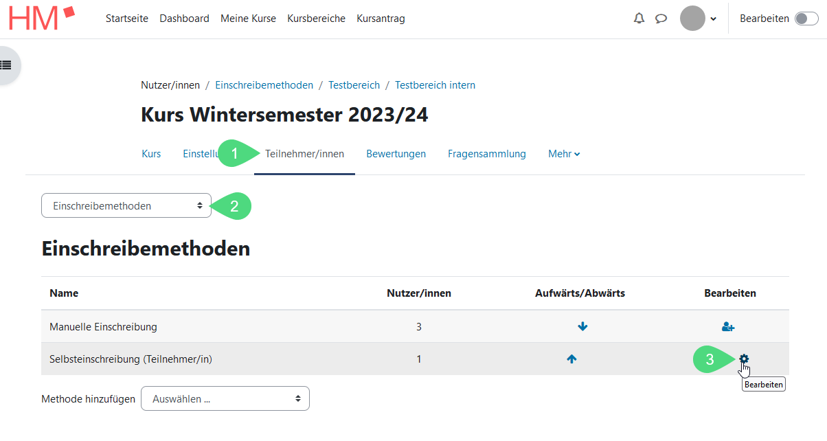 Sie finden den Zugangsschlüssel über die Kursnavigation. Klicken Sie zuerst auf <Teilnehmer/innen> (1). Im Dropdown-Menü auf der linken Seite steht Eingeschriebene Nutzer/innen. Klicken Sie darauf, um das Dropdown-Menü zu öffnen und wählen Sie dann <Einschreibemethoden>(2) aus. Klicken Sie dann auf das Stiftsymbol (3), um die Einstellungen für die Selbsteinschreibung aufzurufen.