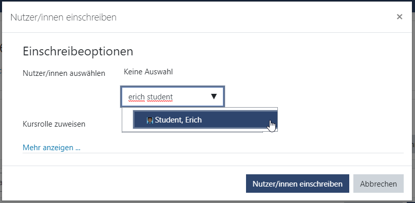 Rufen Sie über die Kursnavigation mit Klick auf <Teilnehmer/innen> die Teilnehmerliste auf. Klicken Sie anschließend auf <Nutzer/innen einschreiben>. Unter "Kursrolle zuweisen" ist <Teilnehmer/in> ausgewählt.