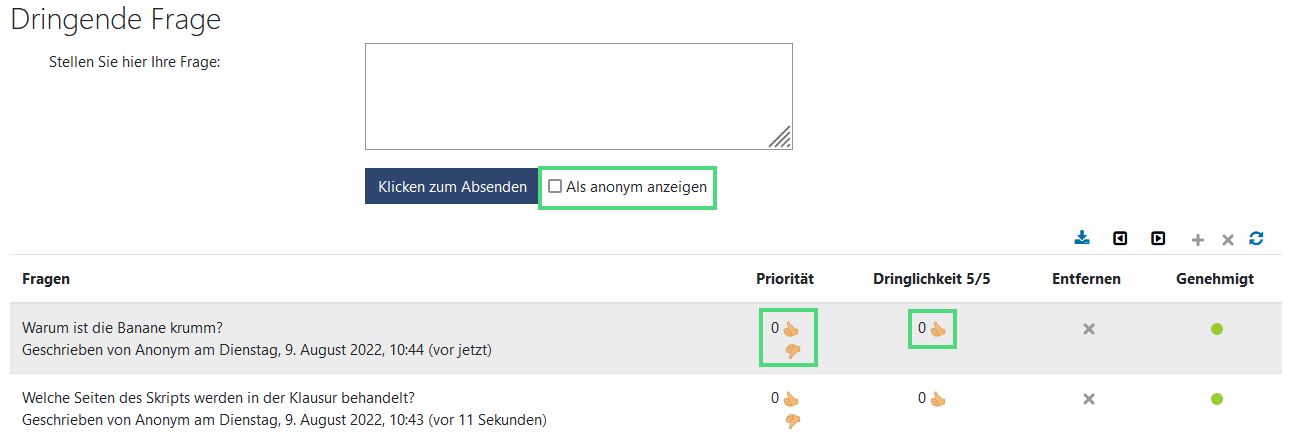 Teilnehmer/innen können über "Dringlichkeit" 5 Fragen anderer Kursteilnehmer/innen auch eine Stimme geben.